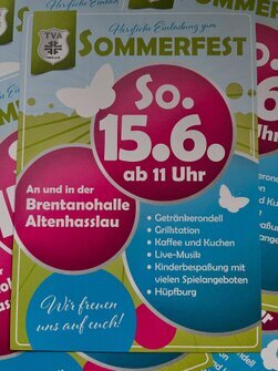 Der TV Altenhasslau lädt am 15.6.2025 zum diesjährigen Sommerfest ein, Start ist um 11.00 Uhr an und in der Brentanohalle.